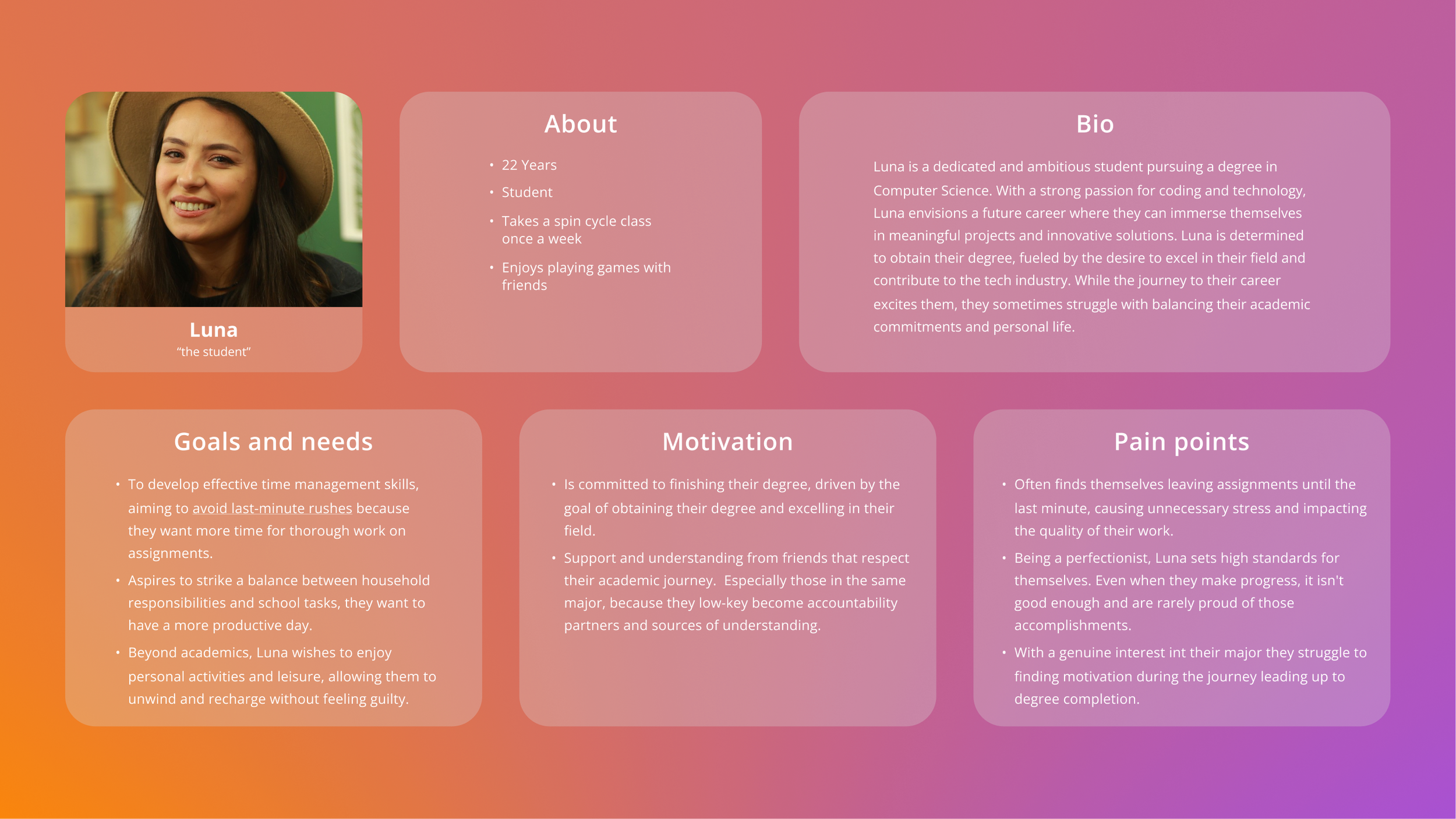 Even though users had unique lifestyles, they shared common study habits. I recognized recurring patterns in the users’ goals and pain points and incorporated them into a user persona.