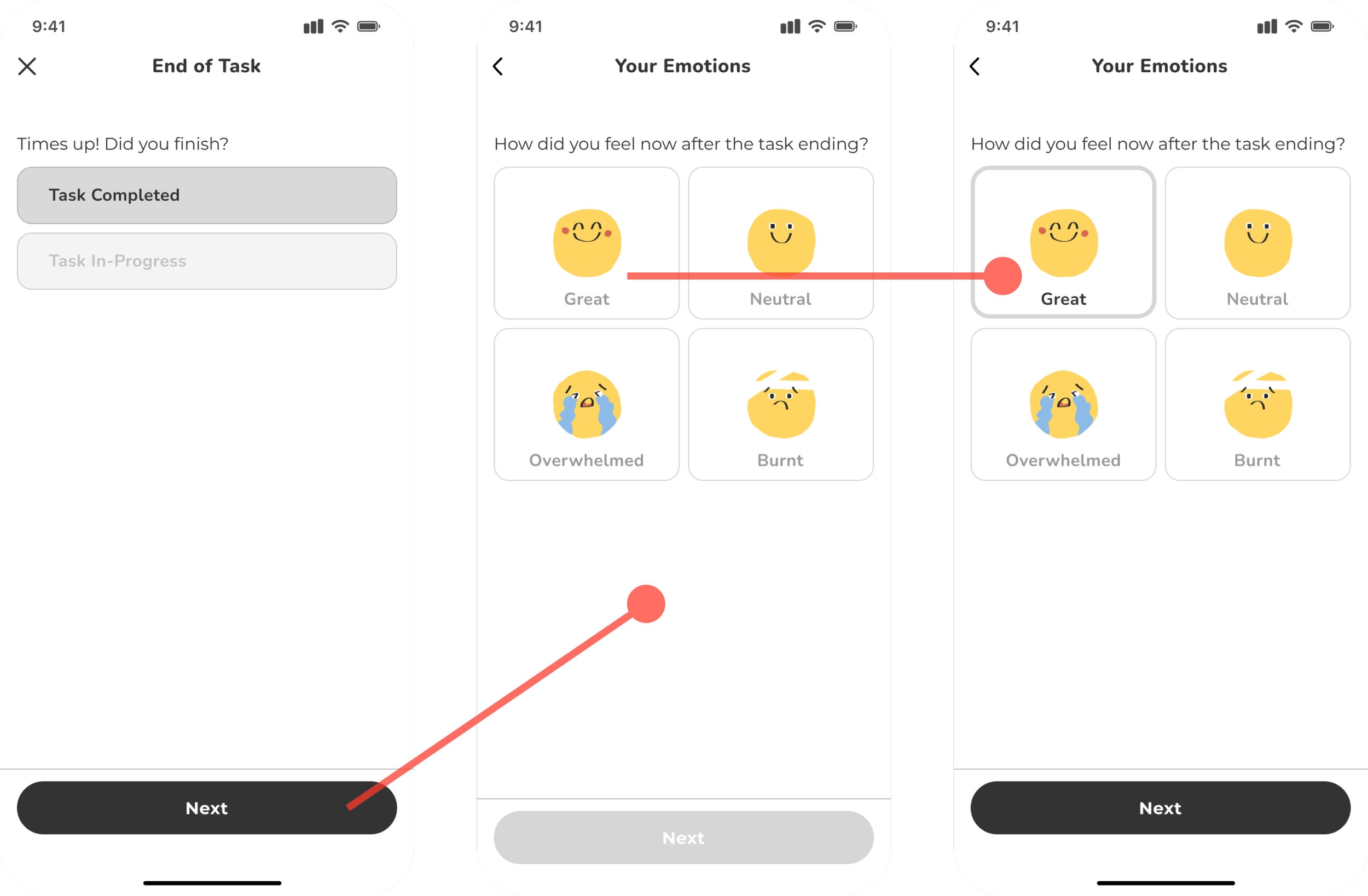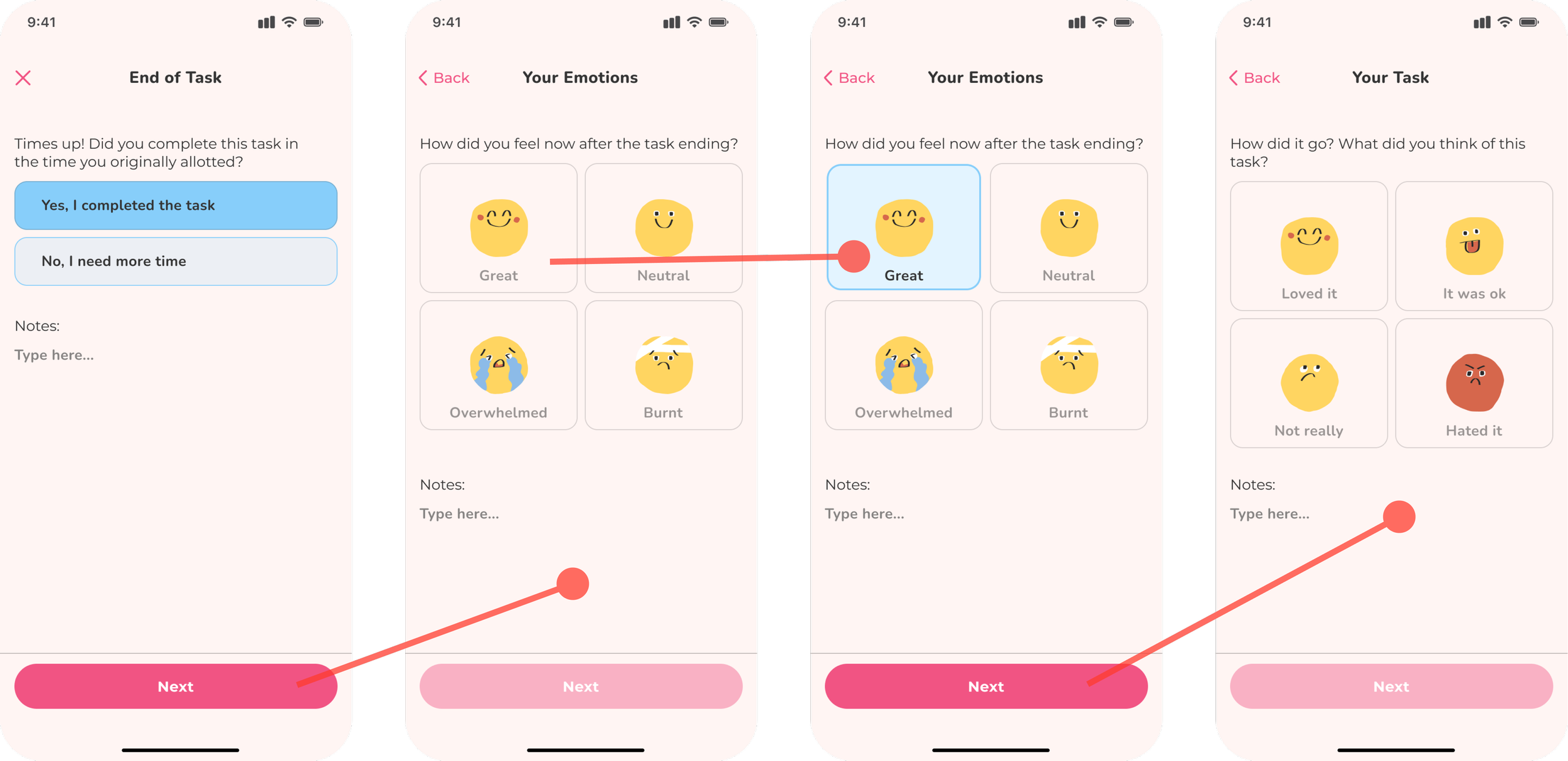 Now I say that but I did have an issue; in the first iterations specifically in the “Task Initiation” flow, I did not mark areas where the user would be “on” or “off” the app. This is crucial because I need to let the users take breaks and send them notifications.