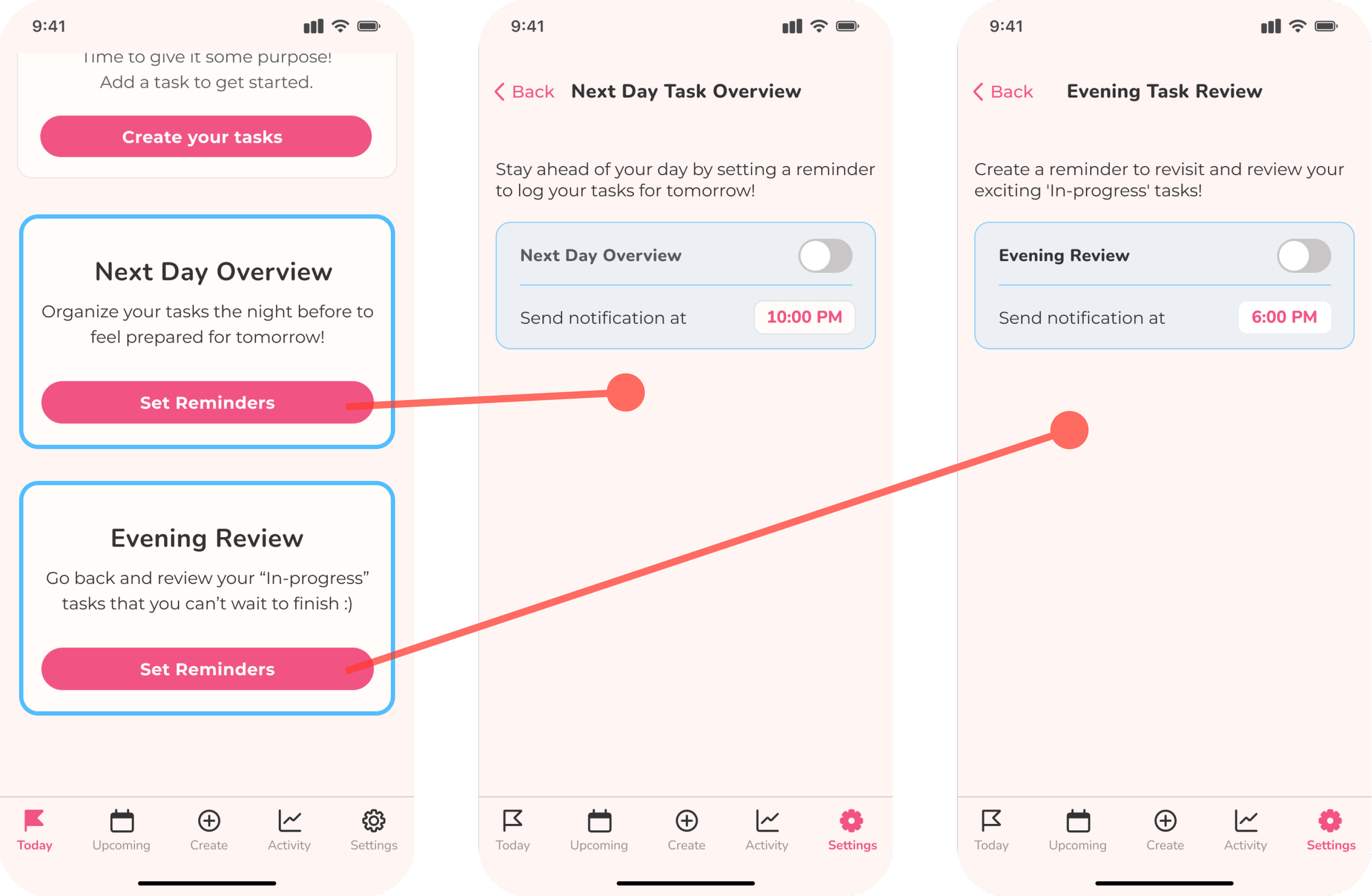 Cards function to direct them to ‘Reminders’ in ‘Settings’
