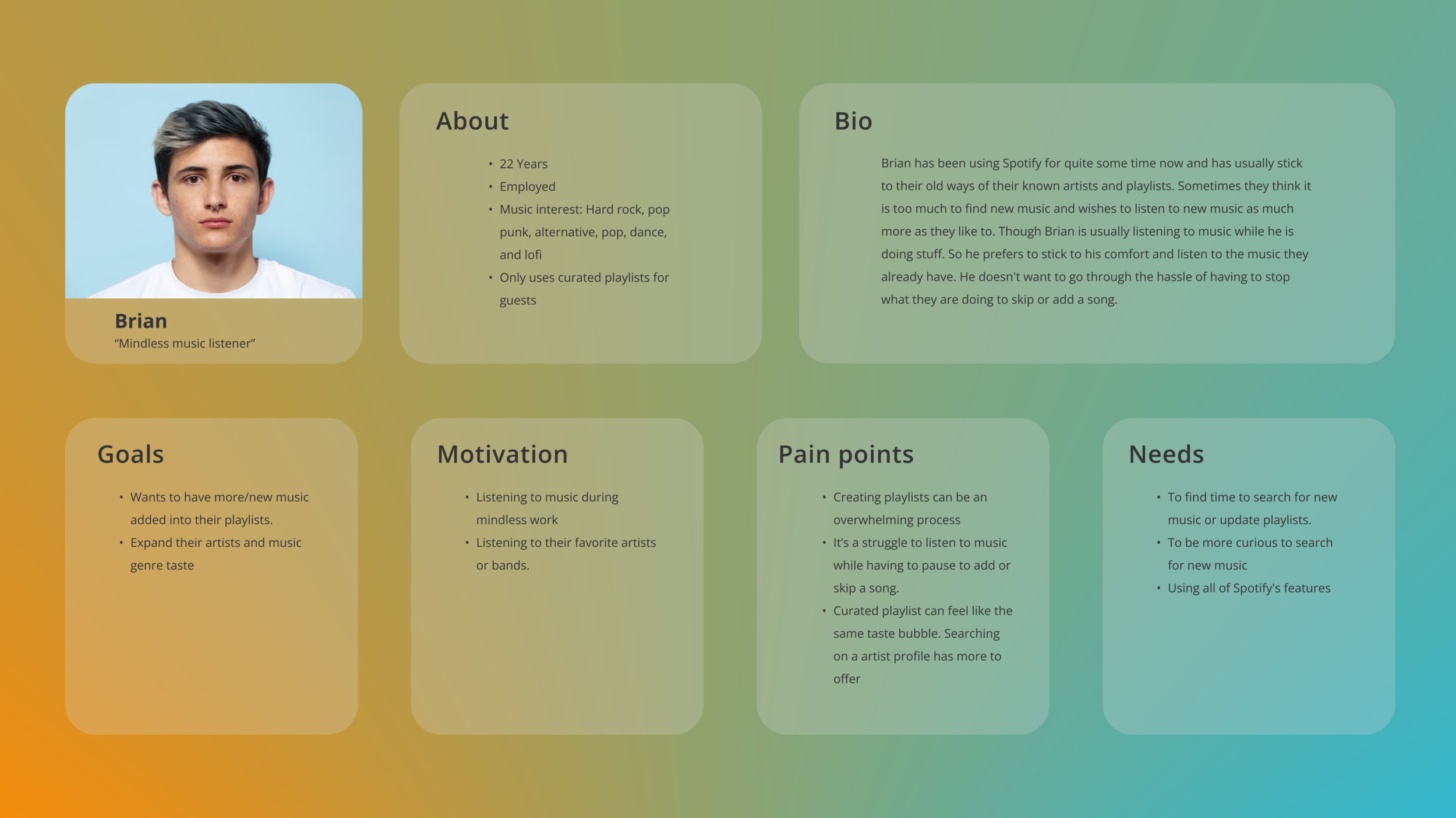 Recognizing these recurring patterns my interviewees shared I decided to incorporate them into a user persona.