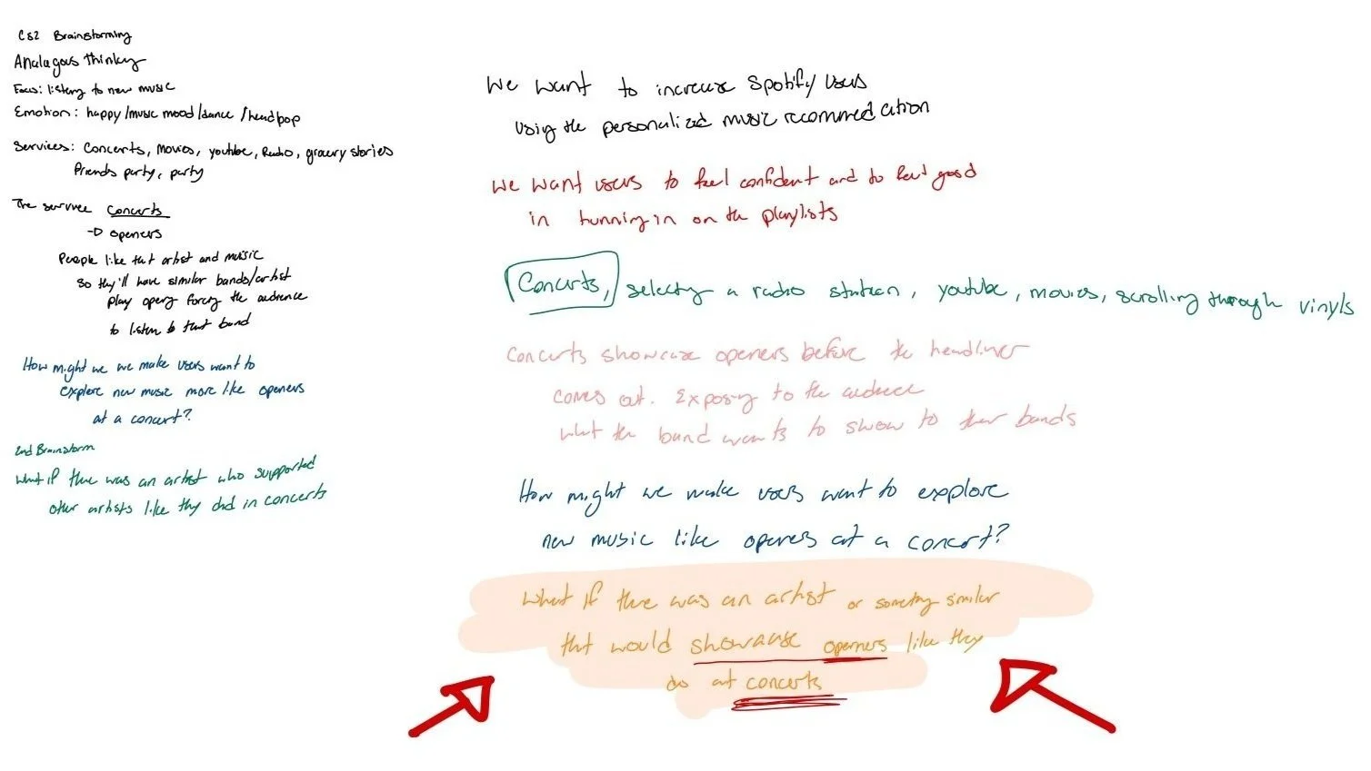 Brainstorming Notes: “What if there was an artist or something similar that would showcase openers as they do at concerts.”